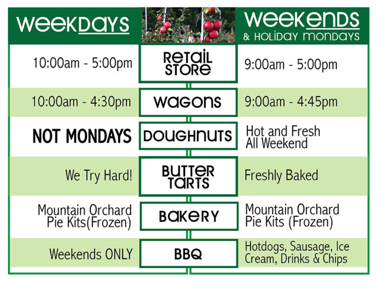 Home Mountain Orchards A Family Tradition Since 1970 Join our Newsletter Mailing List for periodic updates through the season. We are closed for the 2025 season. See you in 2026! PLEASE READ BEFORE VISITING OUR ORCHARD: NEW GROUP LIMITS & PROTOCOLS FOR 2021 ...READ WHAT'S PICKING GETTING HERE What's Available and When? FAQ's OUR NEWSLETTER Join our Newsletter Mailing List so we can share with you what is happening at Mountain Orchards. You will receive our informative newsletter about picking at the Orchard. Email Subscribe ACTIVITIES PHOTO GALLERY SCHOOLS & GROUPS BAKERY | STORE | BBQ GREEN COMMITMENT OUR STORY CONTACT US A Day in the life of Mountain Orchard... Site Map Download Site Map FIND US: 10175 Clark Road, Mountain ON K0E 1S0 1.613.989.5601 team@mountainorchards.ca CONNECT WITH US: Facebook Instagram © Mountain Orchards. All Rights Reserved.